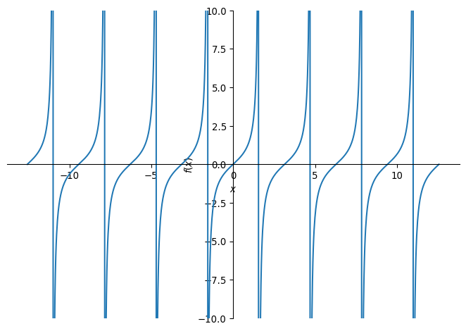 sp.plot(func5, (x,-4*sp.pi,4*sp.pi), ylim = (-10,10))