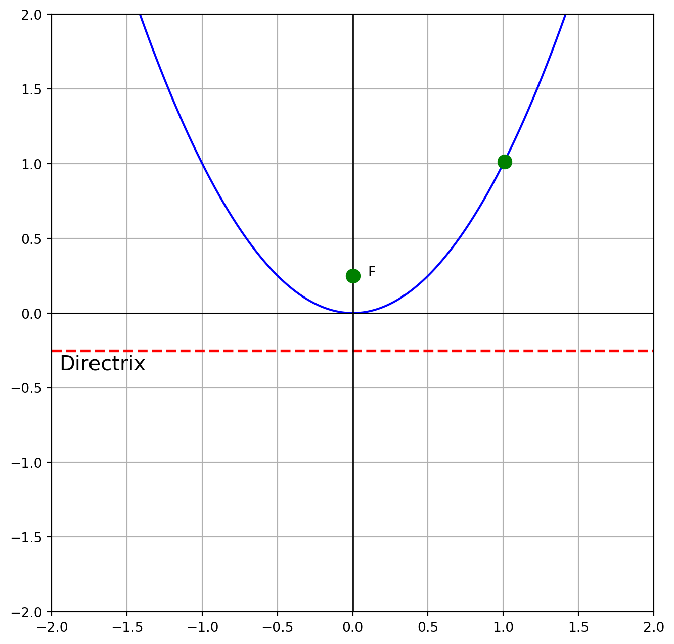 %matplotlib inlineimport numpy as npimport matplotlib.pyplot as pltdef conic(x, tp ='parabola', p = {}):""" x = values at which to compute tp = type of conic p = parameters """if tp =='parabola': y = p['a'] * (x - p['h'])**2+ p['k'] focus = {'x': p['h'], 'y': p['k'] +1/(4* p['a'])}if tp =='circle': circle_x = p['c_x'] + p['r'] * np.cos(x) circle_y = p['c_y'] + p['r'] * np.sin(x)return circle_x, circle_yreturn y, focus## Generate parabolax = np.linspace(-2, 2, 400)params = {'a': 1, 'h': 0, 'k': 0}y, focus = conic(x, 'parabola', p = params)## Point of observationind =300pb_x, pb_y = np.abs(x[ind]), np.abs(y[ind])# Plotplt.figure(figsize=(8, 8))plt.plot(x, y, label='$y = x^2$', color='blue')plt.scatter(focus['x'], focus['y'], color='green', zorder=5, s=100)plt.text(focus['x'] +0.1, focus['y'], 'F')plt.text(focus['x'] -1.95, -focus['y']-0.13, 'Directrix', fontsize=15)plt.scatter(pb_x, pb_y, color='green', zorder =3, s =100)## Plot settingsplt.xlim(-2, 2)plt.ylim(-2, 2)plt.grid(True)plt.axhline(-focus['y'], color='red', linewidth=2, ls ='--')plt.axhline(0, color='black', linewidth=1)plt.axvline(0, color='black', linewidth=1)#__________________________________________#==================================### DO NOT DELETE (Uncomment to show circles)#==================================# ##=============== Circles # radius = np.sqrt((focus['x'] - pb_x)**2 + (focus['y'] - pb_y)**2)# theta = np.linspace(0, 2 * np.pi, 400)# ## Circle A# params = {'c_x': focus['x'], 'c_y': focus['y'], 'r': radius}# theta = np.linspace(0, 2 * np.pi, 400)# circle_x, circle_y = conic(theta, 'circle', p = params)# plt.plot(circle_x, circle_y, color='red')# ## Circle B# params = {'c_x': pb_x, 'c_y': -focus['y'], 'r': radius}# circle_2x, circle_2y = conic(theta, 'circle', p = params)# plt.plot(circle_2x, circle_2y, color='red')# ## Lines# plt.plot([pb_x, pb_x], [-focus['y'], pb_y], '--') #vertical dashed line# plt.plot([0, pb_x], [focus['y'], pb_y], '--') #line from focus to parabola #__________________________plt.show()